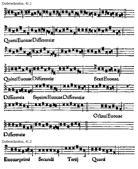 [41] [Dodecachordon, 41,1; text: Quarti Euouae Differentiae, Quinti Euouae Differentiae, Sexti Euouae. Differentia, Septimi Euouae Differentiae, Octaui Euouae Differentiae] [GLADOD1 16GF]