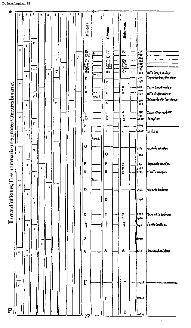 [55] [Dodecachordon, 55; text: Ternae diuisiones, Tres nouenariae, tres quaternariae, tres binariae. 1, 2, 3, 4, 5, 6, 7, 8, 9, F, [Phi], [Digamma], [Gamma], A, B, [sqb], C, D, E, F, G, a, b, c, e, f, g, Aa, Bb, [sqb][sqb], Cc, Dd, Ee, [Proslambanomenos], [Hypate hypaton], [Parypate hypaton], [Lichanos hypaton], [Hypate meson], [Parypate meson], [Lichanos meson], [MESE], [Paramese], [Trite diezeugmenon], [Paranete diezeugmenon], [Nete diezeugmenon], [Trite hyperbolaion], [Paranete hyperbolaion], [Nete hyperbolaion], Diatonon, Chroma, Enharmonion, 11664, 10944, 10368, 9216, 8748, 8192, 7988, 7776, 7296, 6912, 6144, 5988, 5832, 5472, 5184, 4608, 4374, 4096, 3992, 3888, 3648, 3456, 3072, 2994, 2916, 2736, 2592, 2304, 2187, 2048, 1996, 1944, 1824, 1728, 1536, Semitonium] [GLADOD1 18GF]