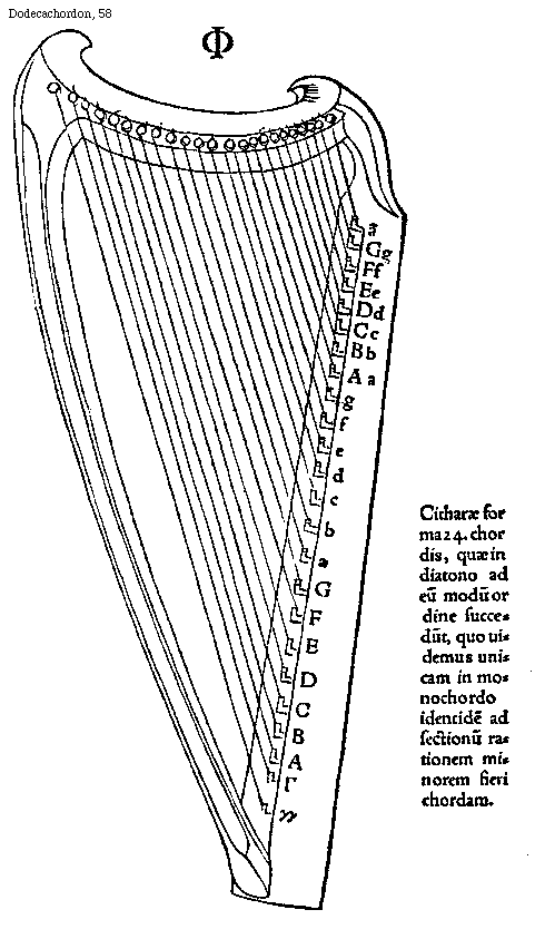 [58] [Dodecachordon, 58; text: [Phi], [Digamma], [Gamma], A, B, C, D, E, F, G, a, b, c, d, e, f, g, Aa, Bb, Cc, Dd, Ee, Ff, Gg, a[macron supra lin.], Citharae forma 24. chordis, quae in diatono ad eum modum ordine succedunt, quo uidemus unicam in monochordo identidem ad sectionum rationem minorem fieri chordam.] [GLADOD1 19GF]