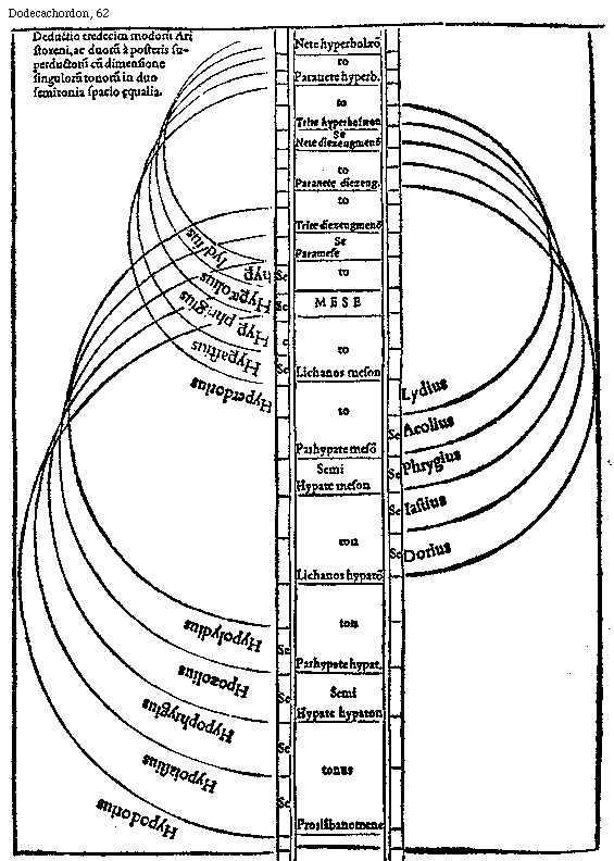 [Dodecachordon, 62; text: Deductio tredecim modorum Aristoxeni, ac duorum a posteris superductorum cum dimensione singulorum tonorum in duo semitonia spacio aequalia. Hypodorius, Hypoiastus, Hypophrygius, Hpoaeolius, Hypolydius, Dorius, Iastius, Phrygius, Aeolius, Lydius, Hyperdorius, Hyperastius, Hyperphrigius, Hyperaeolius, hyperlydius, Proslambanomene, Hypate hypaton, Parhypate hypaton, Lichanos hypaton, Hypate meson, Parhypate meson, Lichanos meson, MESE, Paramese, Trite diezeugmenon, Paranete diezeugmenon, Nete diezeugmenon, Trite hyperbolaeon, Paranete hyperbolaeon, Nete hyperbolaeon, Tonus, Semitonium] [GLADOD1 20GF]