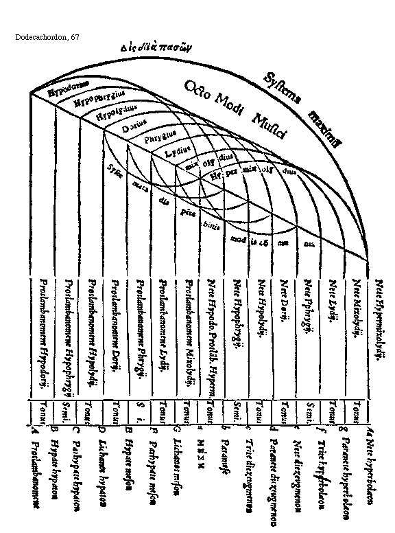 [Dodecachordon, 67; text: [Disdiapason], Systema maximum, Octo Modi Musici, Hypodorius, Hypophrygius, Hypolydius, Dorius, Phrygius, Lydius, mixolydius, Hypermixolydius, Systemata diapente binis modis communia, Nete Hypermixolydij. Nete Mixolydij. Nete Lydij. Nete Pphrygij. Nete Dorij. Nete Hypolydij. Nete Hypophrygij. Nete Hypodorij. Proslambanomene Hypermixolydij. Proslambanomene Mixolydij. Proslambanomene Lydij. Proslambanomene Phrygij. Proslambanomene Dorij. Proslambanomene Hypolydij. Proslambanomene Hypophrygij, Proslambanomene Hypodorij. Tonus, Semitonium, A, B, C, D, E, F, G, a, b, c, d, e, f, g, Aa, Proslambanomene, Hypate hypaton, Parhypate hypaton, Lichanos hypaton, Hypate meson, Parhypate meson, Lichanos meson, [MESE], Parmese, Trite diezeugmenon, Paranete diezeugmenon, Nete diezeugmenon, Trite hyperbolaeon, Paranete hyperbolaeon, Nete hyperbolaeon] [GLADOD2 01GF]
