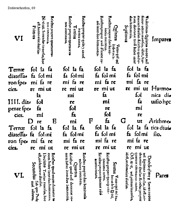 [Dodecachordon, 69; text: VI. Impares, Pares, Vndecimus. Quintus nouus, uel sextus uetus inuersus, id est, harmonice diuisus. Reiectus quod unum duntaxat tonum habet inter duo hemitonia. Septimus, Quintus, Vetus qui mi habet in b. Reiectus propter duo hemitonia continua. Reiectus propter unum duntaxat tonum inter duo hemitonia. Reiectus propter quinque continuatos tonos. Tertius, Reiectus propter quatuor tonos continuos. Nonus. Secundus inuersus, hoc est, harmonice diuisus. Primus, Ternae diatessaron species. IIII. diapente species. Harmonica diuisio haec, Arithmetica diuiso. D, E, F, G, ut, re, mi, fa, sol, la, sol la fa, fa sol mi, mi fa re, re mi ut, Duodecimus, Sextus nouus uel septimus inuersus, id est, arithmetice diuisus. Reiectus propter quatuor continuatos tonos. Octauus, vel primus inversus, id est, arithmetice diuisus. Sextus, Vetus qui mi habet in b fa [sqb] mi, Reiectus propter duo hemitonia minora continua. Quartus, Reiectus quod unum duntaxat tonum habet inter duo hemitonia. Decimus, Tertius inuersus, hoc est, arithmetice diuisus. Secundus, sub quo Ptolemaei octauus.] [GLADOD2 02GF]