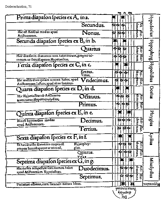 [Dodecachordon, 71; text: Prima diapason species ex A, in a. Secundus. Hic est Aeolius modus apud Aristoxenum. Nonus. Secunda diapason species ex B, in b. Quartus, Haec diuisio in diatonico non habet locum, propter tritonum ac semidiapente. Hyperaeolius. Tertia diapason species ex C, in c. Sextus. Vetus. Hic nostra aetate quinti nomen habet, apud Aristoxenum Iastius, apud alios Ionicus. Vndecimus. Quarta diapason species ex D, in d. Hic Hyperiastius ab Aristoxeno nominatur. Hypomixolydius nobis. Octauus. Primus. Quinta diapason species ex E, in e. Hic est hypoaeolius modus apud Aristoxenum. Decimus. Tertius. Sexta diapason species ex F, in f. Et haec diuisio diatonico inepta est propter Semidiapente ac tritonum. Hyperphrygius. Quintus. Septima diapason species ex G, in g. Hic nostra tempestate sexti nomen habet apud Aristoxenum Hypoiastius. Duodecimus. Septimus. Ptolemaei ocatuus, cum secundo natura Idem. Arithmeticon, Harmonicon, Hypodorius, Hypophrygius, Hypolidius, Dorius, Phrygius, Lydius, Mixolydius, Hypermixolydius, Disdiapason systema maximum, g, c, F] [GLADOD2 03GF]