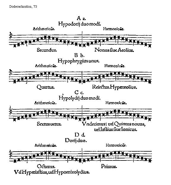 [Dodecachordon, 73; text: A a. Hypodorij duo modi. Arithmetic[os]. Harmonic[os]. Secundus. Nonus siue Aeolius. B b. Hypophrygius unus. Quartus. Reiectus. Hyperaeolius. C c. Hypolydij duo modi. Sextus uetus. Vndecimus: uel Quintus nouus, uel Iastius siue Ionicus. D d. Dorij duo. Octauus. Vel Hyperiastius, uel Hypomixolydius. Primus.] [GLADOD2 04GF]