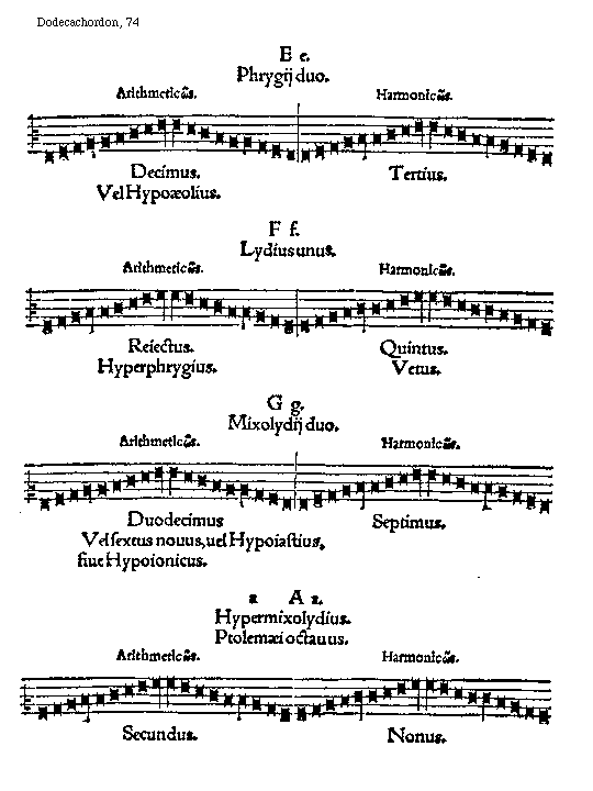 [74] [Dodecachordon, 74; text: E e. Phrygij duo. Arithmetic[os]. Harmonic[os]. Decimus. Vel Hypoaeolius. Tertius. F f. Lydius unus. Reiectus. Hyperphrygius. Quintus. Vetus. G g. Mixolydij duo. Duodecimus Vel sextus nouus, uel Hypoiastius, fiue Hypoionicus. Septimus. a Aa. Hypermixolydius. Ptolemaei octauus. Secundus. Nonus.] [GLADOD2 05GF]