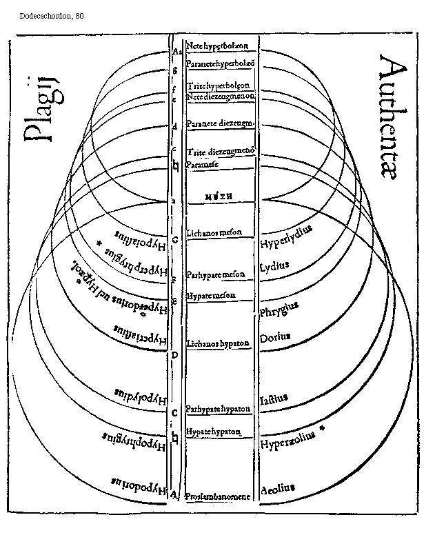 [Dodecachordon, 81; text: Plagij, Authentae, Nete hyperbolaeon, Paranete hyperbolaeon, Trite hyperbolaeon, Nete diezeugmenon, Paranete diezeugmenon, Trite diezeugmenon, Paramese, [MESE], Lichanos meson, Parhypate meson, Hypate meson, Lichanos hypaton, Parhypate hypaton, Hypate hypaton, Proslambanomene, Aeolius, Hyperaeolius, Ionicus, Dorius, Phrygius, Lydius, Mixolydius, Hypodorius, Hypophrygius, Hypolydius, Hypomixolydius, Hypoaeolius, Hyperphrygius, Hypoionicus, Aa, g, f, e, d, c, [sqb], a, G, F, E, D, C, A, Hypermixolydius [to tou Ptolemaiou Heurema]] [GLADOD2 07GF]