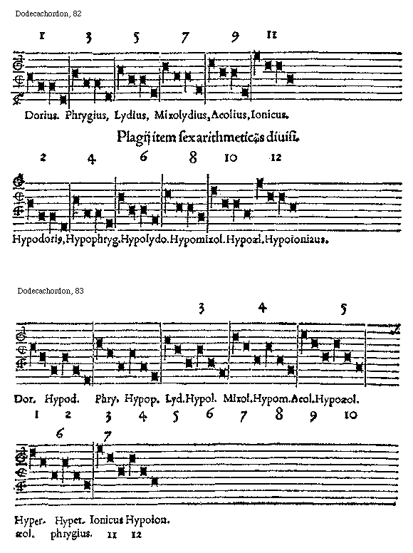 [Dodecachordon, 82; text: 1, 2, 3, 4, 5, 6, 7, 8, 9, 10, 11, 12, Dorius, Phrygius, Lydius, Mixolydius, Aeolius, Ionicus. Plagij item sex arithmetic[os] diuisi. Hypodorius, Hypophrygius, Hypolydius, Hypomixolydius, Hypoaeolius, Hypoioniaus.] [GLADOD2 08GF]