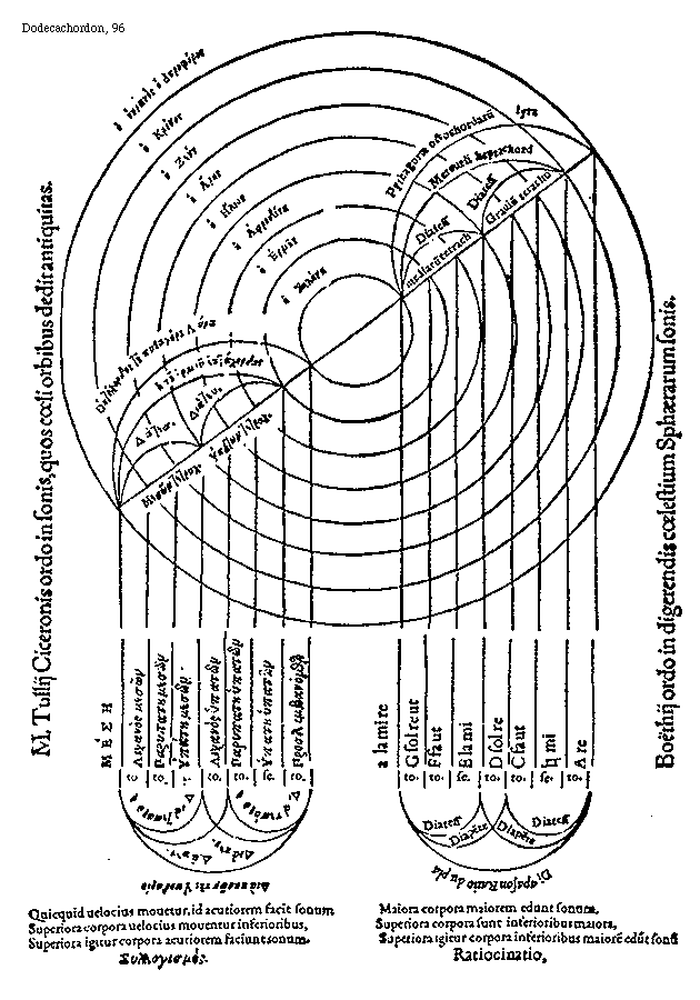 [96] [Dodecachordon, 96; text: Marci Tullij Ciceronis ordo in sonis, quos coeli orbibus dedit antiquitas. Boethij ordo in digerendis coelestium Sphaerarum sonis. Quicquid uelocius mouetur, id acutiorem facit sonum. Superiora corpora uelocius mouentur inferioribus, Superiora igitur corpora acutiorem faciunt sonum. [Syllogismos]. Maiora corpora maiorem edunt sonum. Superiora corpora sunt inferioribus maiora, Superiora igitur corpora inferioribus maiorem edunt sonum, Ratiocinatio, Pythagoras octochordarum lyra, Mercurii heptachord, Diatessaron, mediarum tetrachordum, Grauium tetrachordum, a la mi re, G sol re ut, F fa ut, E la mi, D sol re, C fa ut, [sqb] mi, A re, tonus, semitonium, Diapente, Diapason ratio dupla, [oktochordos tou Pythagorou Lyra, he tou Hermou heptachordos, Diatessaron, Meson tetrachordos, Hypaton tetrachordos, Mese, Lichanos meson, Parypate meson, Hypate meson, Lichanos hypaton, Parypate hypaton, Hypate hypaton, Proslambanomenos, Diapente, Diapason tes Hypodoriou, ho ouranos ho astrophoros, ho Kronos, ho Zeus, ho Ares, ho Helios, he Aphrodite, ho Hermes, he Selene]] [GLADOD2 09GF]