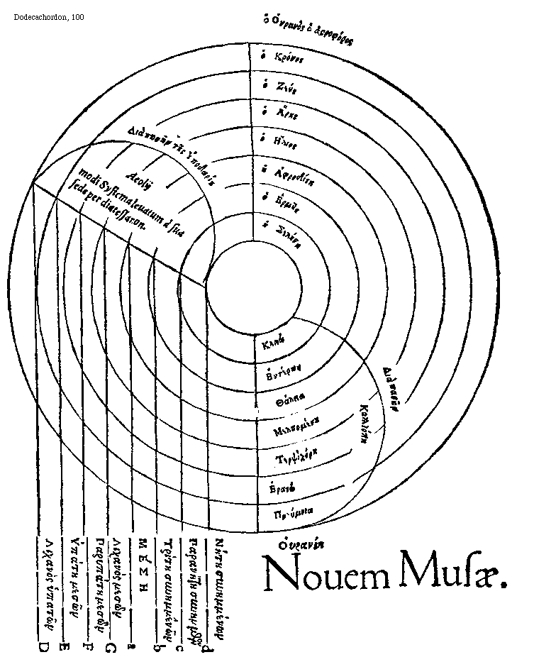 [100] [Dodecachordon, 100; text: Nouem Musae. Aeolij modi Systema leuatum a sua sede per diatessaron. d, c, b, a, G, F, E, D, [Nete synemmenon, Paranete synemmenon, Trite synemmenon, Mese, Lichanos meson, Parypate meson, Hypate meson, Lichanos hypaton, Diapason tes Hypodoriou, ho Ouranos ho astrophoros, ho Kronos, ho Zeus, ho Ares, ho Helios, he Aphrodite, ho Hermes, he Selene, Kleio, Euterpe, Thaleia, Melpomene, Terpsichore, Erato, Polumnia, Ouranie, Kalliope, Diapason]] [GLADOD2 10GF]