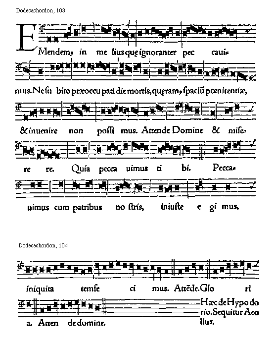 [Dodecachordon, 103; text: EMendemus in melius quae ignoranter peccauimus. Ne subito praeoccupati die mortis, quaeramus spacium poenitentiae, et inuenire non possimus. Attende Domine et miserere. Quia peccauimus tibi. Peccauimus cum patribus nostris, iniuste egimus] [GLADOD2 11GF]