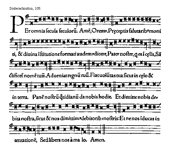 [Dodecachordon, 105; text: PEr omnia secula seculorum. Amen, Oremus. Praeceptis salutaribus moniti, et diuina institutione formati audemus dicere, Pater nsoter, qui est in caelis, Sanctificetur nomen tuum. Adueniat regnum tuum. Fiat uoluntas tua sicut in caelo et in terra. Panem nostrum quotidianum da nobis hodie. Et dimitte nobis debita nostra, sicut et nos dimittimus debitoribus nostris: Et ne nos inducas in tentationem, Sed libera nos a malo. Amen.] [GLADOD2 12GF]
