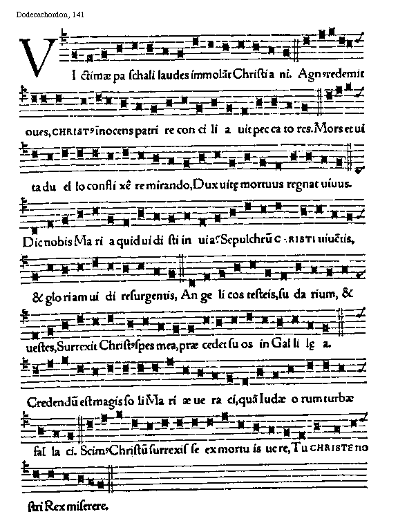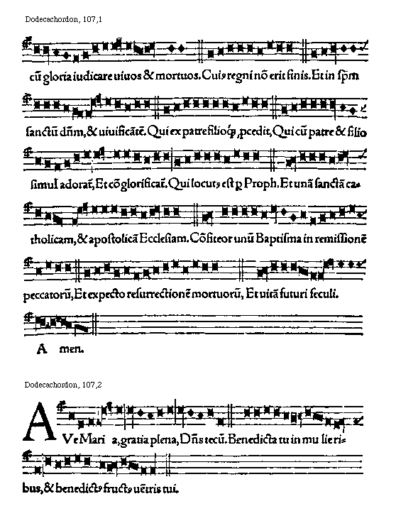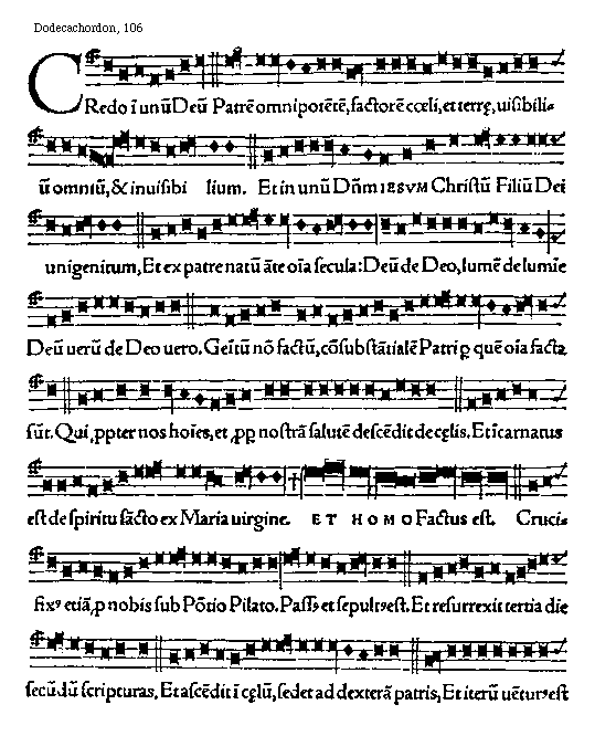 [Dodecachordon, 106; text: CRedo in unum Deum Patrem omnipotentem, factorem coeli, et terrae, uisibilium omnium, et inuisibilium. Et in unum Dominum IESVM Christum Filium Dei unigenitum, Et ex patre natum ante omnia secula: Deum de Deo, lumen de lumine Deum verum de Deo uero. Genitum non factum, consubstantialem Patri per quem omnia facta sunt. Qui propter nos homines, et propter nostram salutem descendit de caelis. Et incarnatus est de spiritu sancto ex Maria uirgine. ET HOMO Factus est. Crucifixus etiam pro nobis sub Pontio Pilato. Passus et sepultus est. Et resurrexit tertia die secundum scripturas. Et ascendit in caelum, sedet ad dexteram patris, Et iterum uenturus est] [GLADOD2 13GF]