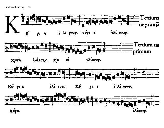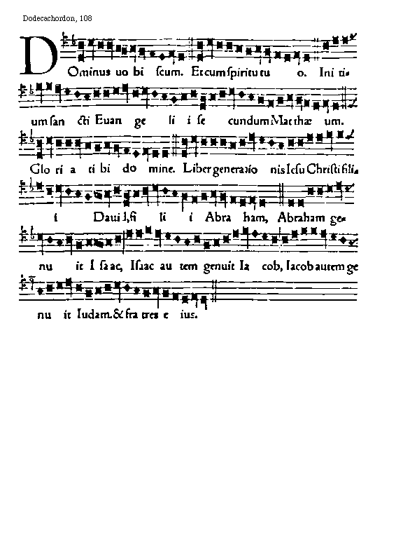 [Dodecachordon, 108; text: DOminus uobiscum. Et cum spiritu tuo. Initium sancti Euangelii secundum Matthaeum. Gloria tibi domine. Liber generationis Iesu Christi filii Dauid, filii Abraham, Abraham genuit Isaac, Isaac autem genuit Iacob, Iacob autem genuit Iudam. et fratres eius.] [GLADOD2 15GF]