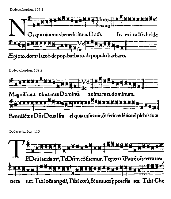 [Dodecachordon, 109,1; text: NOs qui uiuimus benedicimus Dominum. Intonatio, In exitu Israhel de AEgipto. dominus Iacob de populo barbaro. Vel sic] [GLADOD2 16GF]