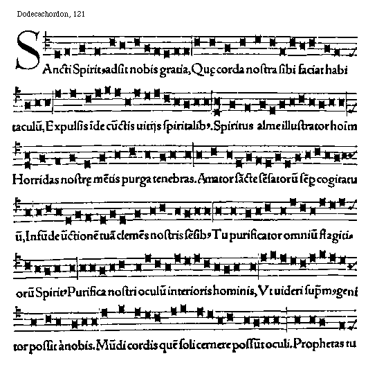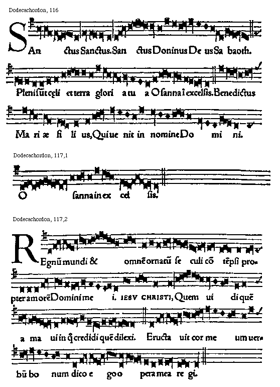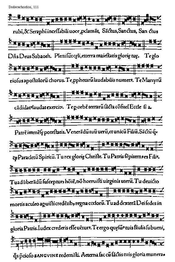 [111] [Dodecachordon, 111; text: et Seraphin incessabili uoce proclamant, Sanctus, Sanctus, Sanctus Dominus Deus Sabaoth. Pleni sunt caeli, et terra maiestatis gloriae tuae. Te gloriosus apostolorum chorus. Te prophetarum laudabilis numerus. Te Martyrum candidatus laudat exercitus. Te per orbem terrarum sancta confitetur Ecclesia. Patrem immensae potestatis. Veneram dum tuum uerum, et unicum Filium. Sanctum quoque Paracletum Spiritum. Tu rex gloriae Christe. Tu Patris sempiternus es Filius. Tu ad liberam dum suscepturus hominem, non horruisti uirginis uterum. Tu deuicto mortis aculeo aperuisti credentibus regna coelorum. Tu ad dexteram Dei sedes in gloria Patris. Iudex crederis esse uenturus. Te ergo quaesumus tuis famulis subueni, quos praecioso SANGVINE redemisti. Aeterna fac cum sanctis tuis gloria munerari.] [GLADOD2 17GF]