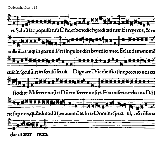 [112] [Dodecachordon, 112; text: Saluum fac populum tuum Domine, et benedic haereditati tuae. Et rege eos, et extolle illos usque in aeternum. Per singulos dies benedicimus te. Et laudamus nomen tuum in saeculum, et in seculum seculi. Dignare Domine die isto sine peccato nos custodire. Miserere nostri Domine miserere nostri. Fiat misericordia tua Domine super nos, quemadmodum sperauimus in te. In te Domine speraui, non confundar in aeternum.] [GLADOD2 18GF]