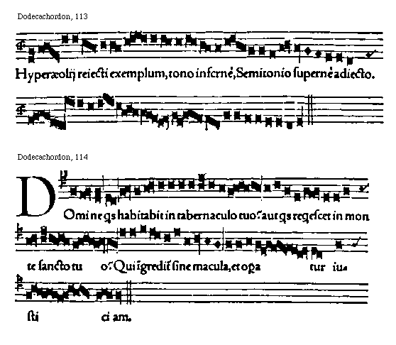 [Dodecachordon, 113; text: Hyperaeolij reiecti exemplum, tono inferne, Semitonio superne adiecto.] [GLADOD2 19GF]