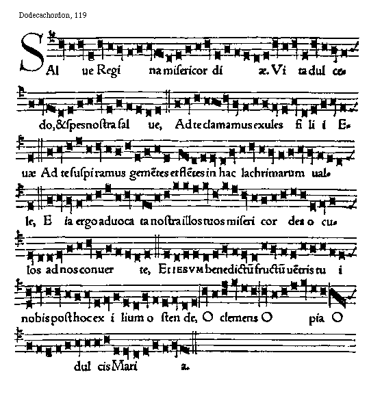 Hic non possum satis ammirari publicam in huius cantus fine hallucinationem, quae ultimam notam in mi torsit, contra et naturam Modi, qui in re deponit cantuum finem, et aurium iudicium, quae sol quidem in clausulis finalibus ut uocant audiunt, mi uero nunquam, sed re, est huius diapente, atque adeo Modi finis. Sequitur nunc Angelica salutatio, tono inferne ut est mos principum ad diapente adiecto, his notulis.