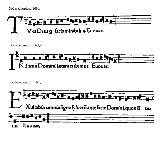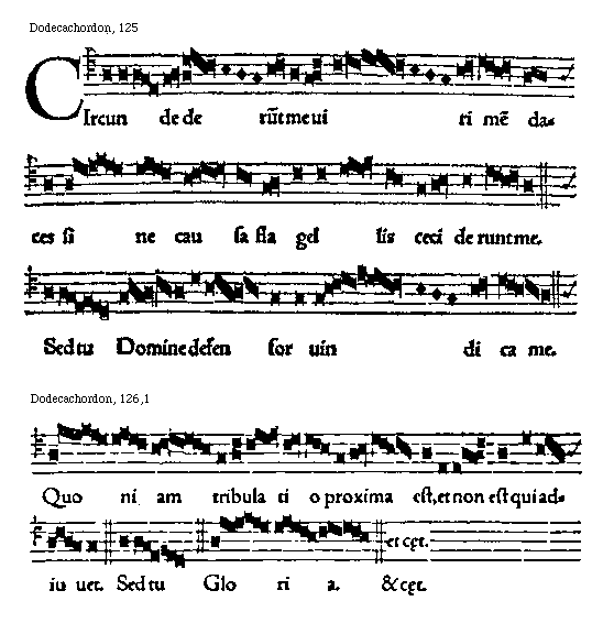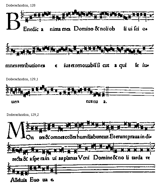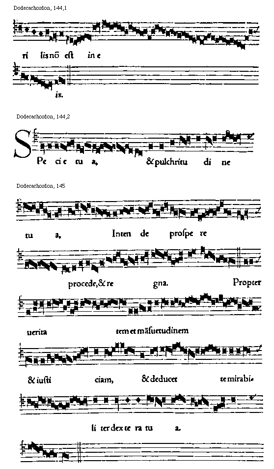 In Psalmis autem maioribus, ut uocant, intonatio est non multum a Dorio differens, quam etiam num in quibusdam coenobijs Hercyniae syluae decantant, ut ipsi saepe audiuimus, eas hic subnectere placuit, quando aliorum Modorum formulas superiore libro exhibuimus, de caeteris, quos supra negleximus, idem suo loco facturi.