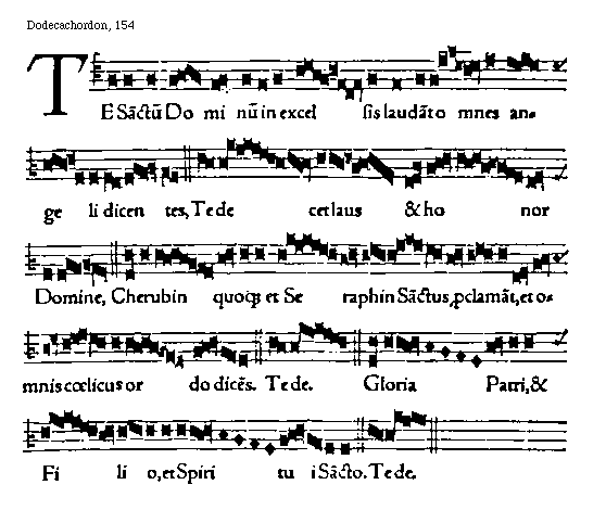 [Dodecachordon, 110; text: TE Deum laudamus, Te Dominum confitemur. Te aeternum Patrem omnis terra ueneratur. Tibi omnes angeli, Tibi coeli, et uniuersae potestates. Tibi Cherubin,] [GLADOD2 16GF]