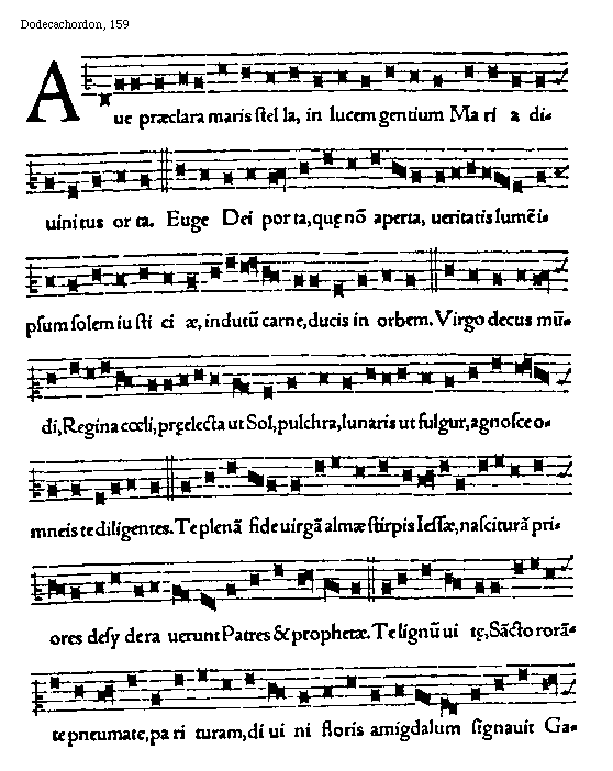 [Dodecachordon, 107,2; text: AVe Maria, gratia plena, Dominus tecum. Benedicta tu in mulieribus, et benedictus fructus uentris tui.] [GLADOD2 14GF]