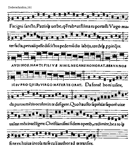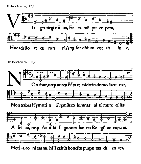 [192] [Dodecachordon, 192,1; text: VIrgo uirginum lux, Et tamen puerpera, Huc adesto te canenti, Atque sordidum cor ablue.] [GLADOD2 65GF]