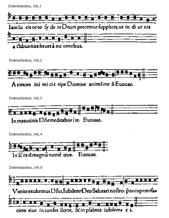 [Dodecachordon, 172,3; text: VOx clamantis in deserto parate uiam Domini rectas facite semitas Dei nostri. Euouae.] [GLADOD2 54GF]