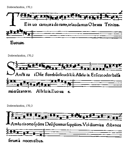 [Dodecachordon, 170,2; text: SAncti tui Domine florebunt sicut lilium. Alleluia. Et sicut odor balsami erunt ante te. Euouae.] [GLADOD2 52GF]