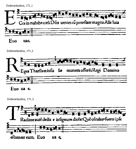 [Dodecachordon, 171,2; text: REges Tharsis et insulae munera offerent Regi Domino Euouae.] [GLADOD2 53GF]