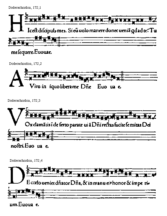 [Dodecachordon, 172,1; text: HIc est discipulus meus. Si eum uolo manere donec ueniam quod ad te? Tu me sequere. Euouae.] [GLADOD2 54GF]