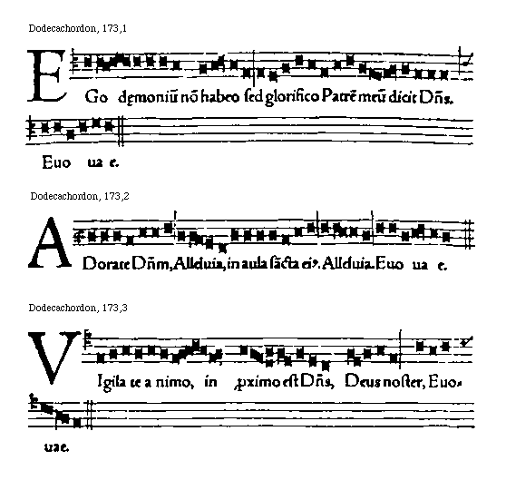 [Dodecachordon, 173,1; text: EGo daemonium non habeo sed glorifico Patrem meum dicit Dominus. Euouae.] [GLADOD2 55GF]