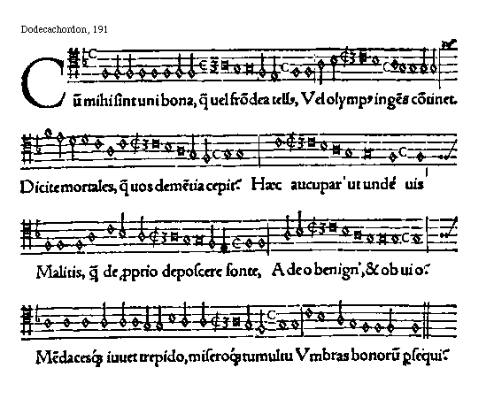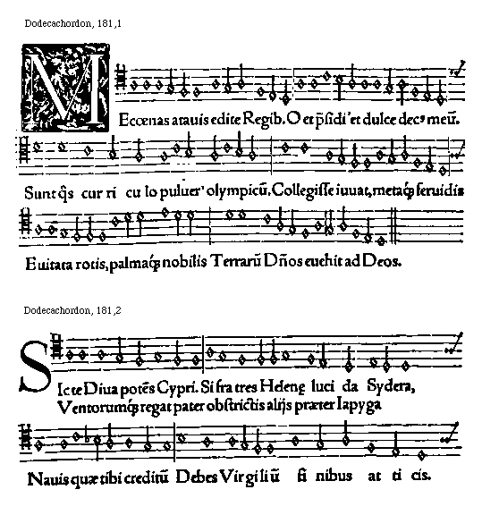 [Dodecachordon, 181,1; text: MEcoenas atauis edite Regibus. O et praesidi' et dulce decus meum. Sunt quos curriculo puluer' olympicum. Collegisse iuuat, metaque feruidis Euitata rotis, palmaque nobilis Terrarum Dominos euehit ad Deos.] [GLADOD2 56GF]