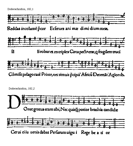 [Dodecachordon, 181,2; text: SIc te Diua potens Cypri. Si fratres Helenae lucida Sydera, Ventorumque regat pater obstrictis alijs praeter Iapyga nauis quae tibi creditum Debes Virgilium finibus atticis.] [GLADOD2 56GF]
