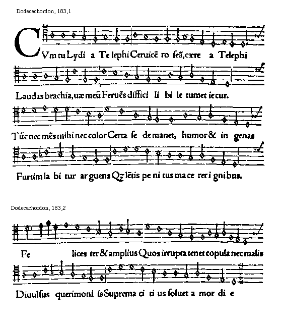 [Dodecachordon, 183,1; text: CVm tu Lydia Telephi Ceruicem roseam, caerea Telephi Laudas brachia, uae meum Feruens difficili bile tumet iecur. Tunc nec mens mihi nec color Certa sede manet, humor et in genas Furtim labitur arguens Quam lentis penitus macerer ignibus.] [GLADOD2 58GF]