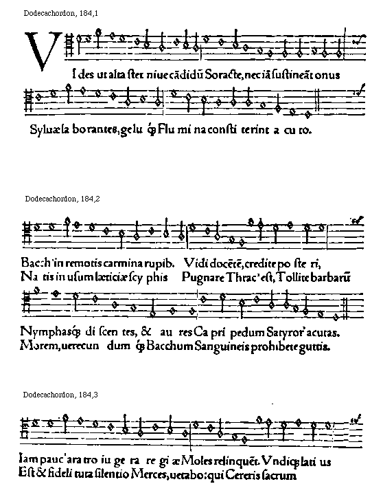 [Dodecachordon, 184,2; text: Bacch' in remotis carmina rupibus. Vidi docentem, credite posteri, Natis in usum laeticiae scyphis Pugnare Thrac' est, Tollite barbarum Nymphasque discentes, et aures Capripedum Satyror' acutas. Morem, uerecundumque Bacchum Sanguineis prohibete guttis.] [GLADOD2 59GF]