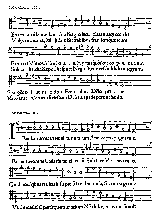 [185] [Dodecachordon, 185,1; text: Extenta uisentur Lucrino Stagna lacu, platanusque coelebs Vulgarit arcanae, sub ijsdem Sit trabibus fragilemque mecum Euincet Vlmos. Tum uiolaria, Myrtusque, et omnis copia narium Soluat Phaselum. Saepe Diespiter Neglectus incest' addidit integrum. Spargent oliuetis odorem Fertilibus Domino priori Raro antecedentem scelestum Deseruit pede poena claudo.] [GLADOD2 60GF]