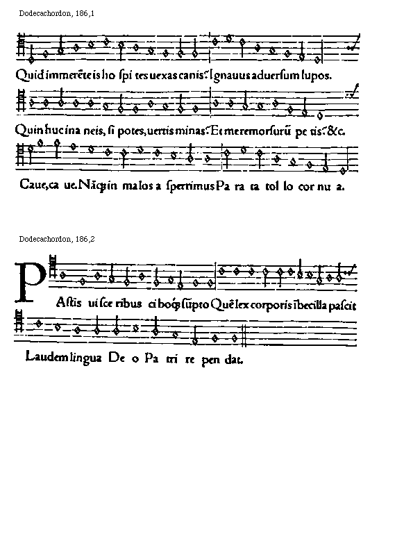 [Dodecachordon, 186,1; text: Quid immerenteis hospites uexas canis? Ignauus aduersum lupos. Quin huc inaneis, si potes, uertis minas? Et me remorsurum petis? Et caetera. Caue, caue. Namque in malos asperrimus Parata tollo cornua.] [GLADOD2 61GF]