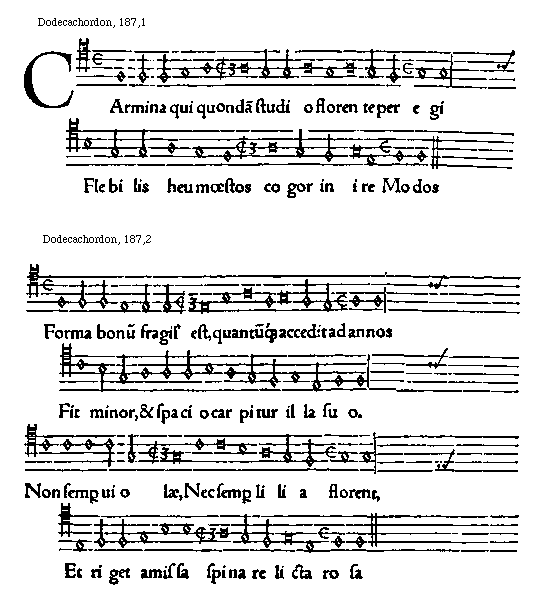 [Dodecachordon, 187,1; text: CArmina qui quondam studio florente peregi Flebilis heu moestos cogor in ire Modos] [GLADOD2 62GF]