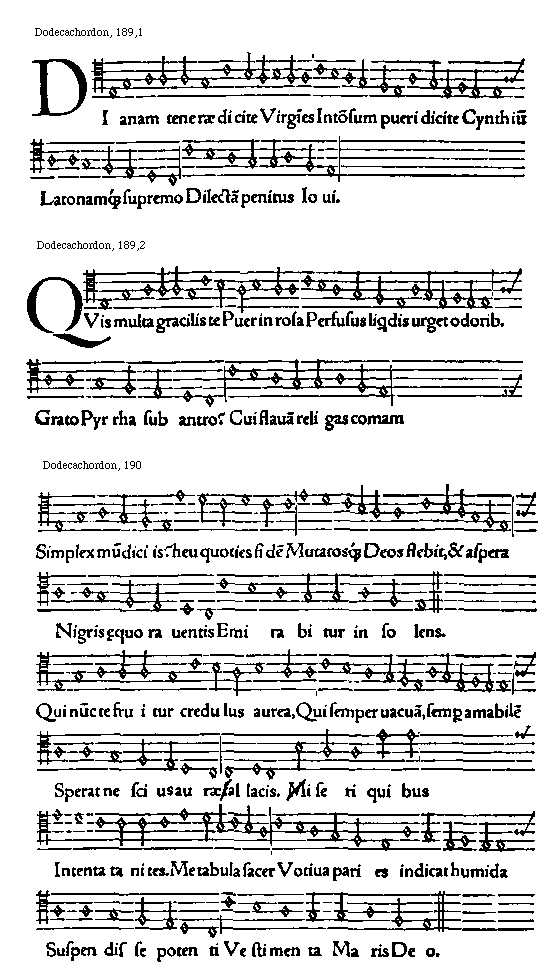 [Dodecachordon, 189,1; text: DIanam tenerae dicite Virgines Intonsum pueri dicite Cynthium Latonamque supremo Dilectam penitus Ioui.] [GLADOD2 63GF]