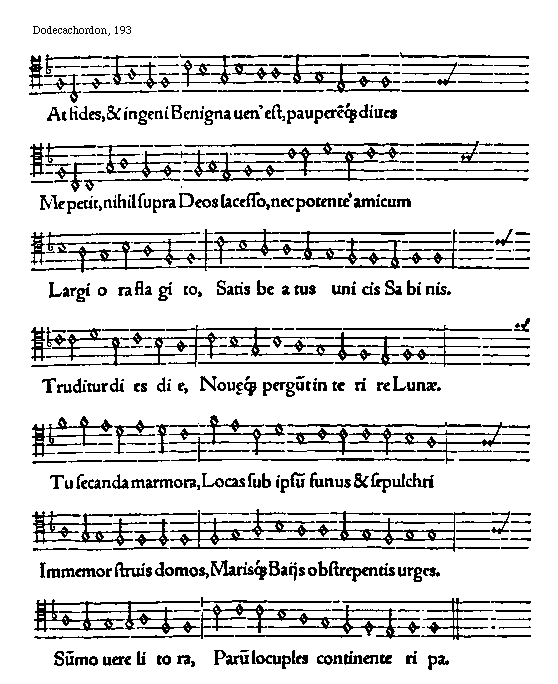 [193] [Dodecachordon, 193; text: At fides, et ingeni Benigna uen' est, pauperemque diues Me petit, nihil supra Deos lacesso, nec potente' amicum Largiora flagito, Satis beatus unicis Sabinis. Truditur dies die, Nouaeque pergunt interire Lunae. Tu secanda marmora, Locas sub ipsum funus et sepulchri Immemor struis domos, Marisque Baijs obstrepentis urges. Summouere litora, Parum locuples continente ripa.] [GLADOD2 66GF]