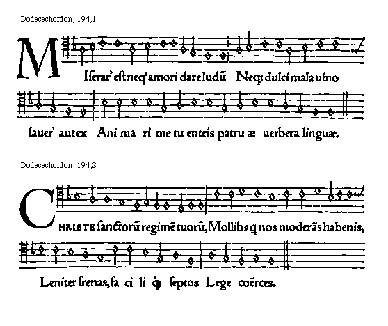 [Dodecachordon, 194,2; text: CHRISTE sanctorum regimen tuorum, Mollibus qui nos moderans habenis, Leniter frenas, facilique septos Lege coerces.] [GLADOD2 67GF]