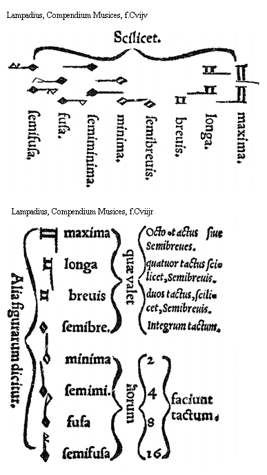 [Lampadius, Compendium Musices, f.Bijv,1; text: Quare uocantur, Mediae? Acutae? Minutae? quia, intra infimas et supremas ponuntur. acutum sonum praebent. minutis ac pusillis literis scribuntur.] [LAMCOM 01GF]