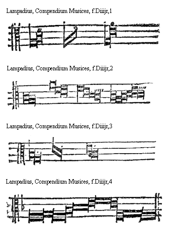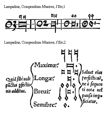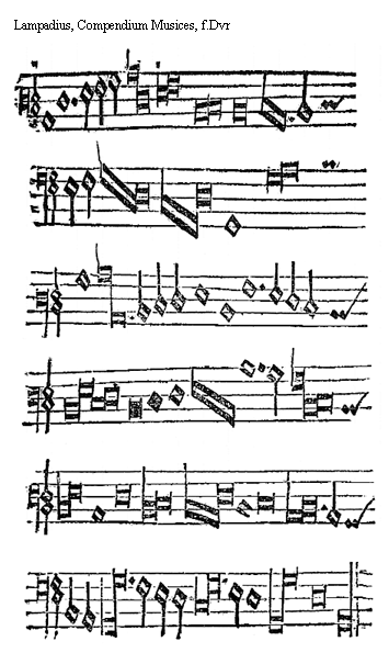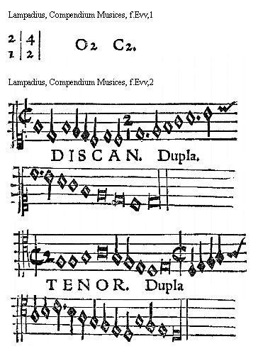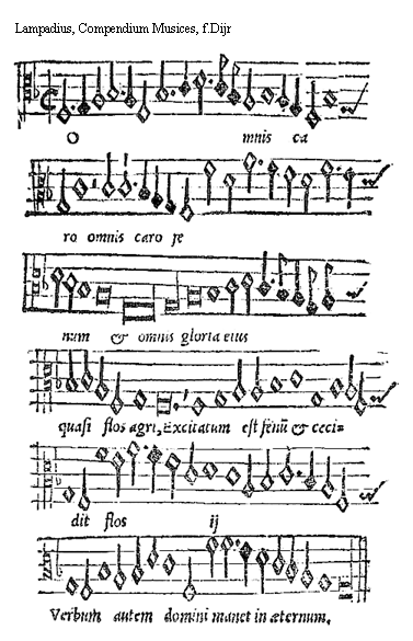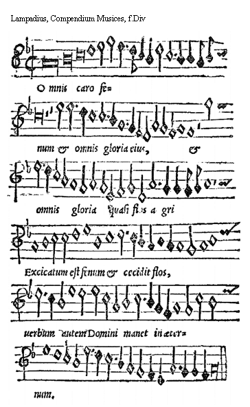 Source: Compendium musices, tam figurati quam plani cantus ad formam dialogi, in usum ingenuae pubis ex eruditis Musicorum scriptis accurate congestum, quale ante hac nunquam uisum, et iam recens publicatum. Adiectis etiam regulis de concordantiarum et componendi cantus artificio, summatim omnia musices praecepta pulcherrimis exemplis illustrata, succincte et simpliciter complectens (Bern: Samuel Apiarius, 1554).