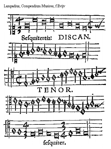 Quomodo construitur sesquiquarta? quum quinque notulae, contra quatuor, eiusdem speciei, ponuntur, signaturque sic. [f.Eviijr] [Lampadius, Compendium Musices, f.Eviijr,1; text: 5, 4, TENOR Sesquiquarta. BASSVS.] [LAMCOM 31GF]