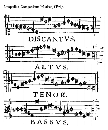 [Lampadius, Compendium Musices, f.Eviijv; text: DISCANTVS. ALTVS. TENOR. BASSVS.] [LAMCOM 32GF]