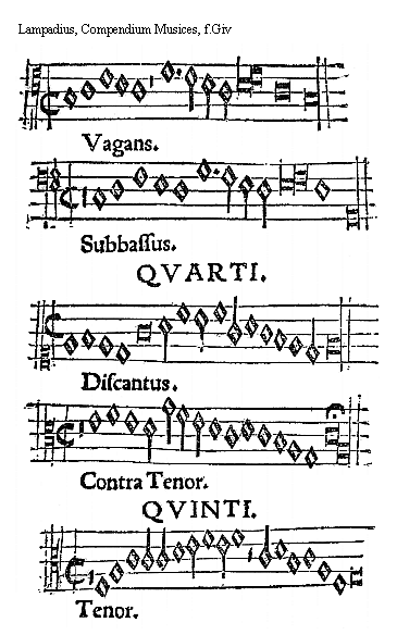 [f.Giv] [Lampadius, Compendium Musices, f.Giv; text: Vagans. Subbassus. Discantus. Contra Tenor. Tenor. QVARTI. QVINTI.] [LAMCOM 38GF]