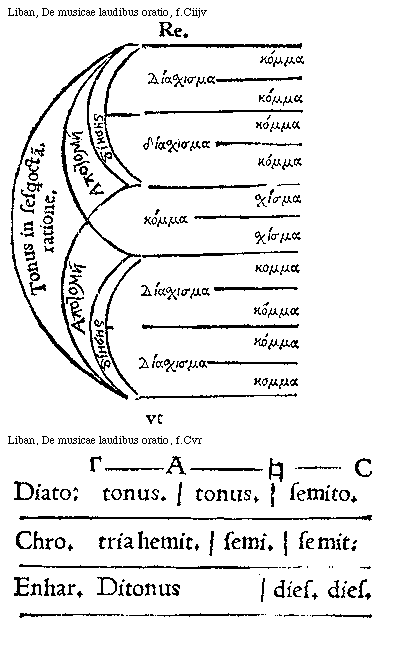 [Liban, De musicae laudibus oratio, f.Cvr; text: [Gamma], A, [sqb], C, Diatonicum, tonus, semitonium, Chromaticum, tria hemitonia, semitonium, Enharmonicum, Ditonus, diesis] [LIBDEM 01GF]