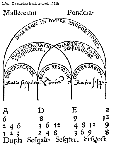 [Liban, De musicae laudibus oratio, f.Dijr; text: Malleorum Pondera. DIAPASON IN DVPLA PROPORTIONE. DIAPENTE, RATIO sesquialtera. DIATESSARON. Ratio sesquitercia. RATIO SESQVIOCTAVA. Tonus. A, D, E, a, 6, 8, 9, 12, 2, 4, 3, 1, Dupla, Sesquialtera, Sesquitertia, Sesquioctaua] [LIBDEM 03GF]