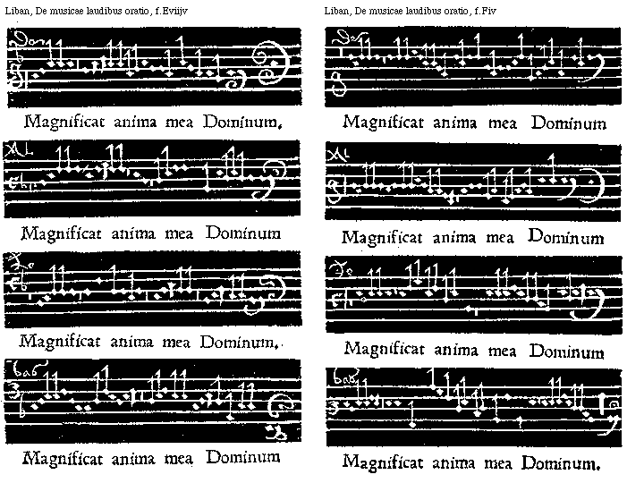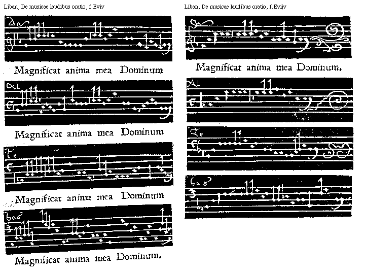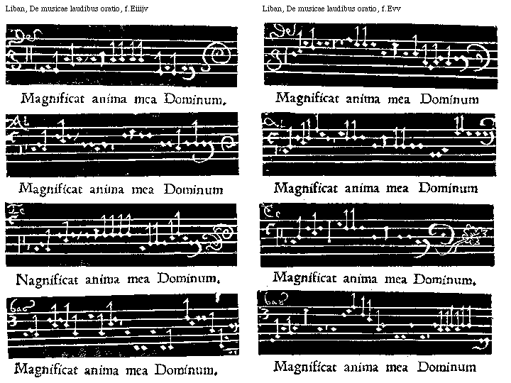 [Liban, De musicae laudibus oratio, f.Evijv; text: Descantus, Magnificat anima mea Dominum. Altus, Tenor, Bassus] [LIBDEM 06GF]