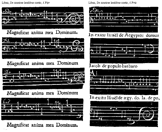 [Liban, De musicae laudibus oratio, f.Eiijv; text: Descantus, Magnificat anima mea Dominum. Altus, Tenor, Bassus] [LIBDEM 04GF]